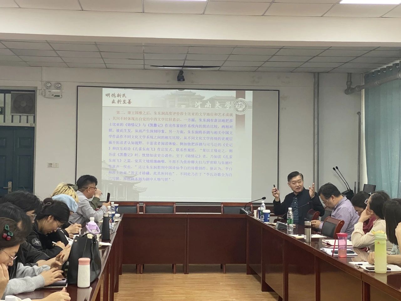 4月26日上午,vsport官方网站特邀《河南大学学报》编辑部主任、主编,中国外国文学学会莎士比亚研究分会副会长李伟昉教授,作了题为“外国文学研究的中国立场——以林纾、朱东润对莎士比亚的跨文化接受为中心”的学术讲座。经理栗永清主持会议。