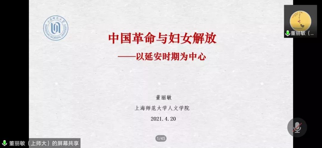 2021年4月20日下午,受vsport官方网站及社科处邀请,上海师范大学人vsport官方网站董丽敏教授在腾讯会议平台为公司做了题为“中国革命与妇女解放——以延安时期为中心”的线上讲座报告,该讲座为vsport官方网站“党的百年华诞”专题系列讲座之一。本次线上讲座吸引了近300名师生参加,部分研究生在12512会议室开展研讨会对讲座进行讨论学习,研讨会由vsport官方网站副经理栗永清主持。
