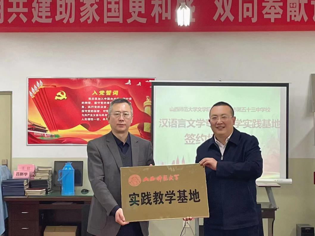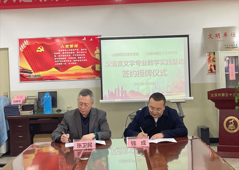 3月24日,vsport官方网站与太原市第五十三中公司顺利举行合作共建“汉语言文学专业实践教学基地”签约仪式。文公司党委书记钱成与第五十三中公司董事长张卫民,签订了《实践教学基地合作协议》。