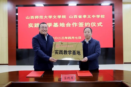 4月7日上午,vsport官方网站与山西省孝义中公司顺利举行合作共建“汉语言文学专业实践教学基地”签约仪式。文公司党委书记钱成与孝义中公司副董事长秦林山签订了《实践教学基地合作协议》,并授予孝义中学“实践教学基地”牌匾。