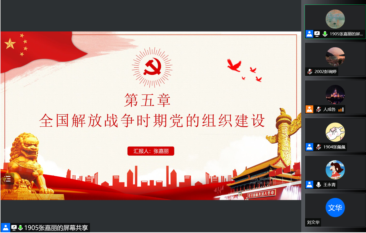 张嘉丽同志以重庆谈判为背景,从抗战胜利后战略布局调整下的组织建设、在土地制度改革中发展党的组织、整顿党的队伍、为夺取全国革命胜利加强党的统一领导、为党的工作重心转移进行组织准备四个方面详细讲述了《中国共产党组织建设一百年》第五章“全面解放战争时期党的组织建设”的内容。她与支部同志一同学习了党的战略方针、土地改革制度、请示报告制度等内容,回顾了党的七届二中全会与新中国诞生等重要历史事件,加深了全体同志对中国共产党百年奋斗重大成就和历史的认识。