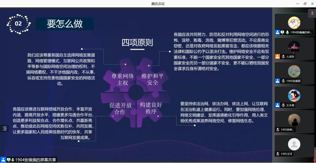 张佩佩同志从“为什么”“怎么做”两大方面出发,系统讲解了《习近平谈网络强国论述摘编》第九章“共同构建网络空间命运共同体”的内容。她结合“清洁网络计划”分析了网络安全面临的挑战,用“四项原则”“五点主张”阐明了如何构建和平、安全、开放、合作的网络空间的问题。她总结道:“中国始终倡导求同存异、休戚与共、平等尊重,构建和平、安全、开放、合作的网络空间,建立多边、民主、透明的全球互联网治理体系。我们要把握时代机遇,奉献力量。”