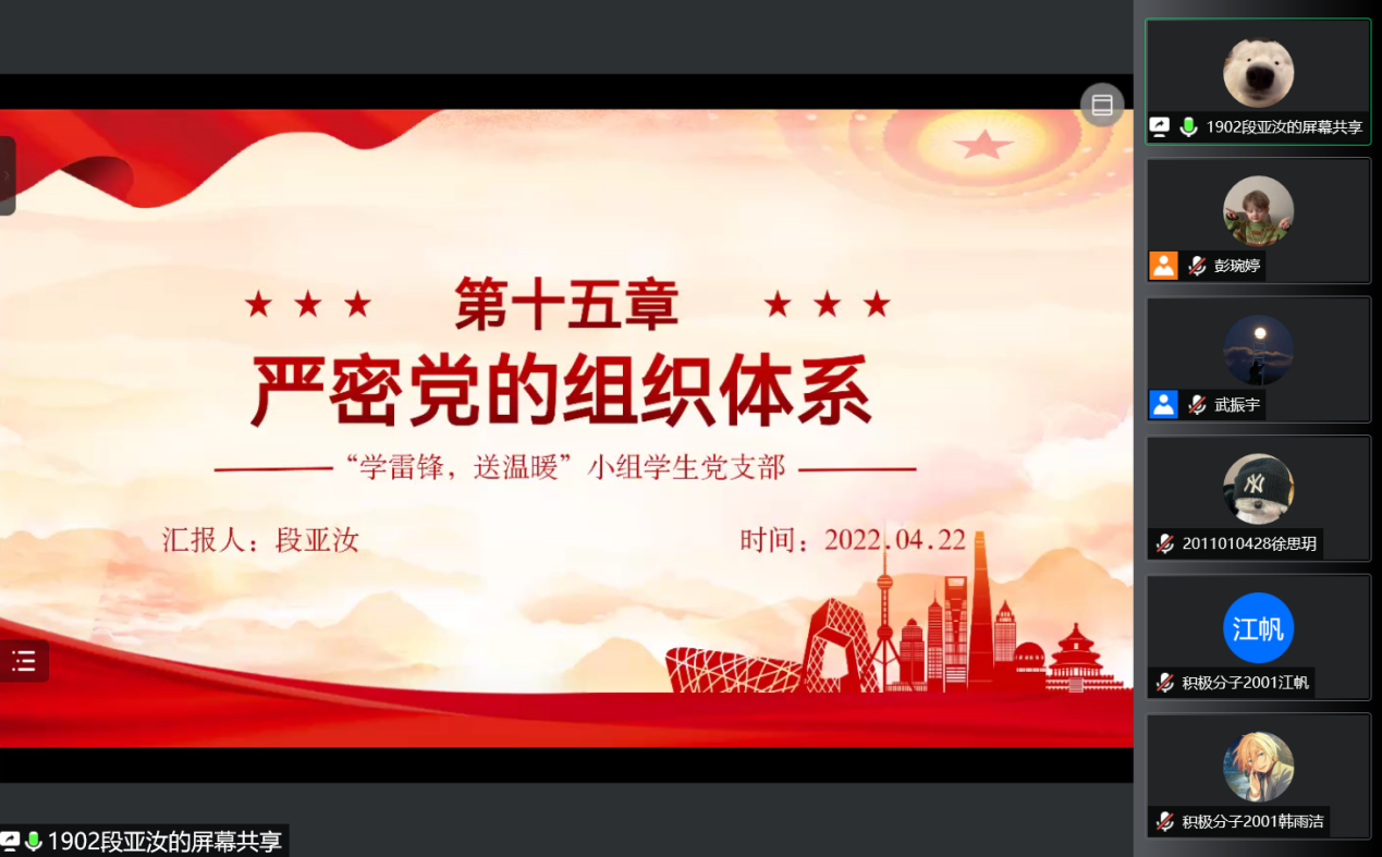 4月22日,vsport官方网站“学雷锋,送温暖”小组员工党支部在腾讯会议学习山西干部在线平台视频与《中国共产党组织建设一百年》第十五章专题学习。活动由支部副书记武振宇主持,支部全体党员和入党积极分子参加。员工党员段亚汝同志担任主讲人。