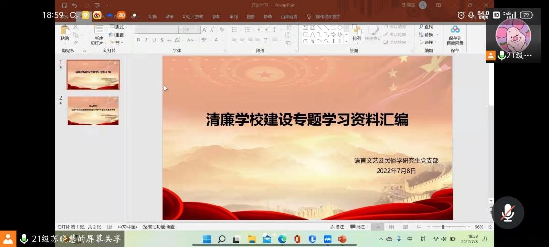 7月8日下午19点,语言文艺及民俗学研究生党支部在线上召开会议,深入学习《清廉公司建设专题学习资料汇编》。本次会议由苏晓慧主持,全体党员参加。