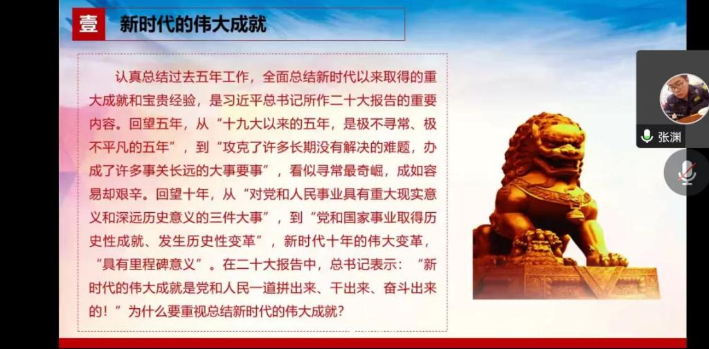 会议伊始,全体党员在张丽娟的带领下学习习近平总书记在中国共产党第二十次全国代表大会上的报告报告指出:党的二十大是在全党全国各族人民迈上全面建设社会主义现代化国家新征程、向第二个百年奋斗目标进军的关键时刻召开的一次十分重要的大会。交流环节上,张渊、白艺娜、赵晓霞,刘维霄四位党员同志围绕党的二十大报告”这一专题,通过观看视频和分析讲解内容的形式展开分享。