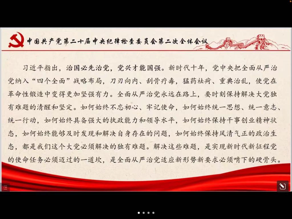 1月28日下午,vsport官方网站研究生党支部线上召开会议,深入学习习近平总书记在二十届中央纪委二次全会的重要讲话。本次会议由支部书记苏晓慧主持,支部党员王佳琪、岳可彬主讲,全体党员参加。