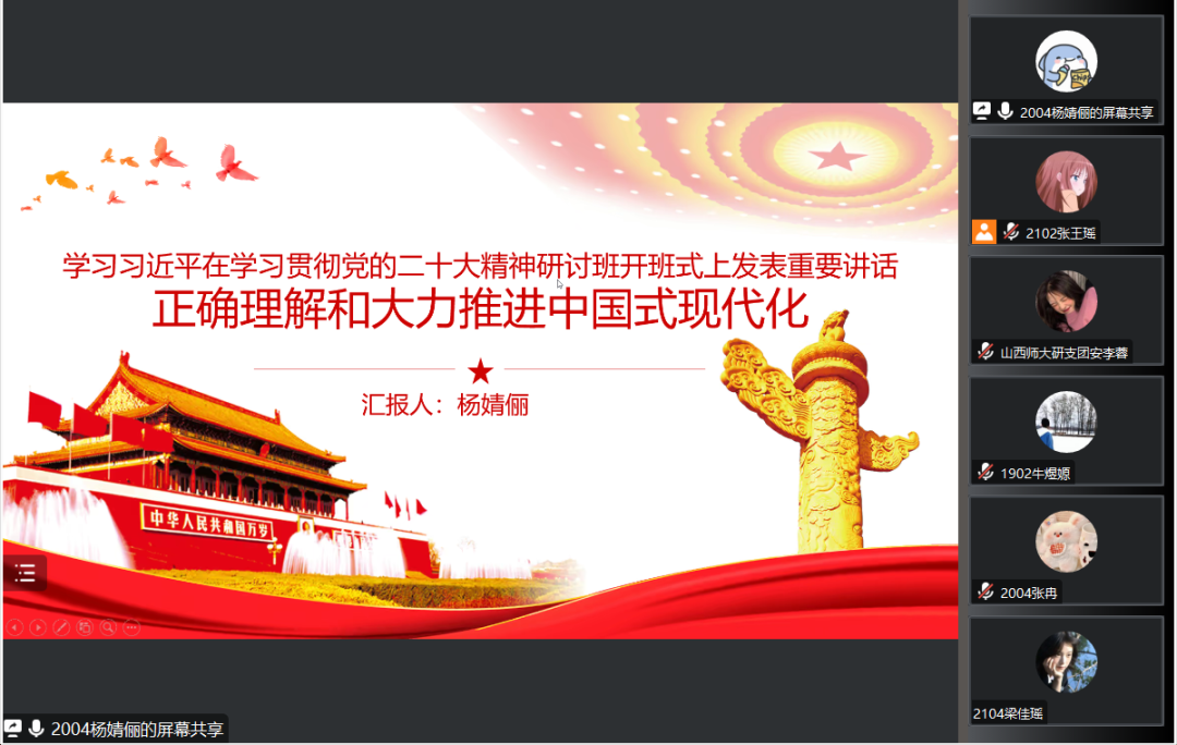 2月13日,vsport官方网站“学雷锋,送温暖”小组员工党支部于线上开展“正确理解和大力推进中国式现代化”主题党日活动。会议由支部书记安李蓉主持,支部全体党员参加。员工党员杨婧俪同志担任主讲人。