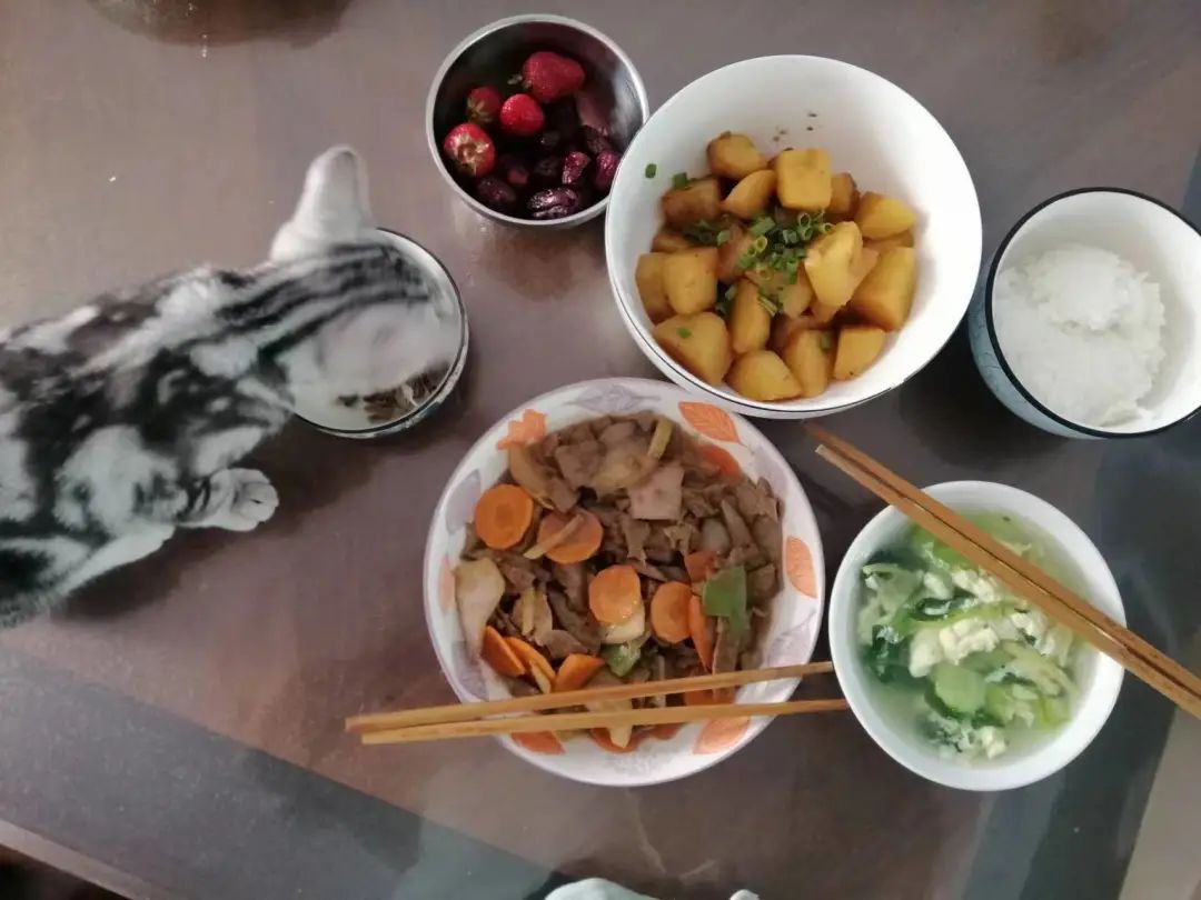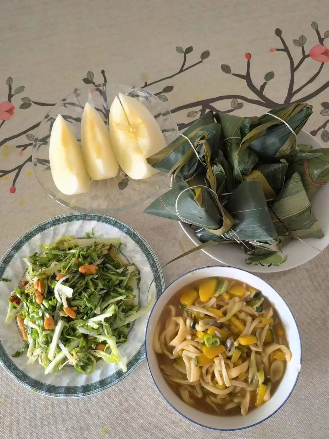 凉拌苦菊、手工粽子、白兰瓜、南瓜面