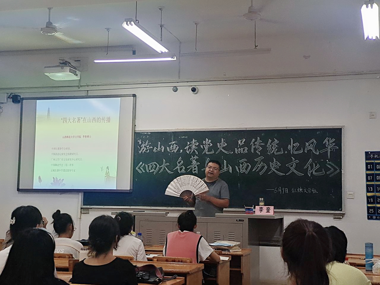 为加深同学们对山西历史文化的理解,感受五千年文明传统中三晋文化的无穷魅力,激发同学们对山西红色文化的学习兴趣,提高同学们对党史的认识,6月9日,红烛文学社在12206教室举办了以“游山西,读党史,品传统,忆风华——《四大名著与山西历史文化》”为主题的讲座,讲座采用“线上+线下”的方式开展,180余名同学参加,李奎老师为主讲人。