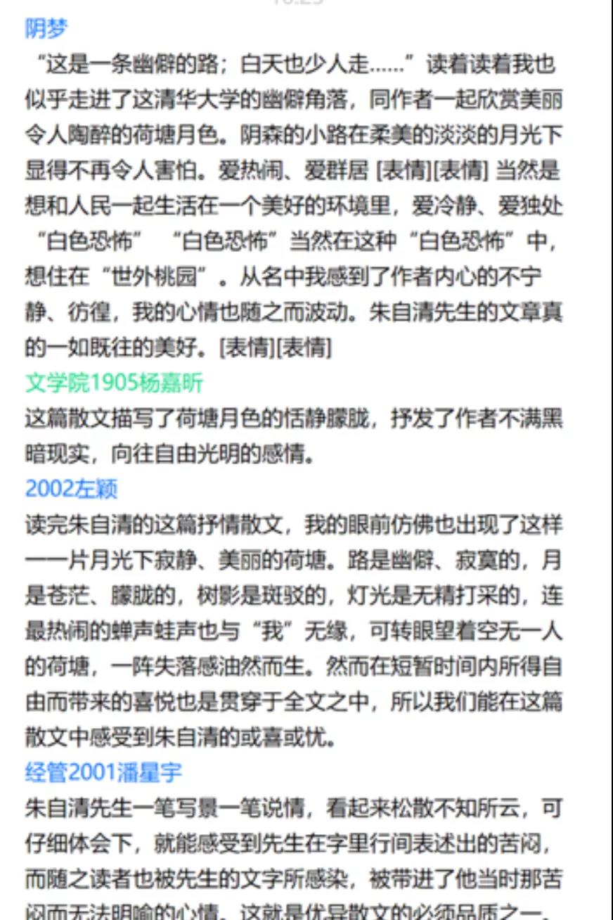 在线上,同学们在留言板积极发言。他们的发言文笔精妙,情思精巧。vsport官方网站董蜜蜜说:“尽情享受这无边的荷香月色,如果我有一方这样的风景,属于我自己,我想象不出自己会是多么雀跃,多么富有。”经管公司潘星宇说道:“朱自清先生一笔写景一笔说情,仔细体会下,就能感受到先生苦闷无法明喻的心情,他的散文真切感人。”