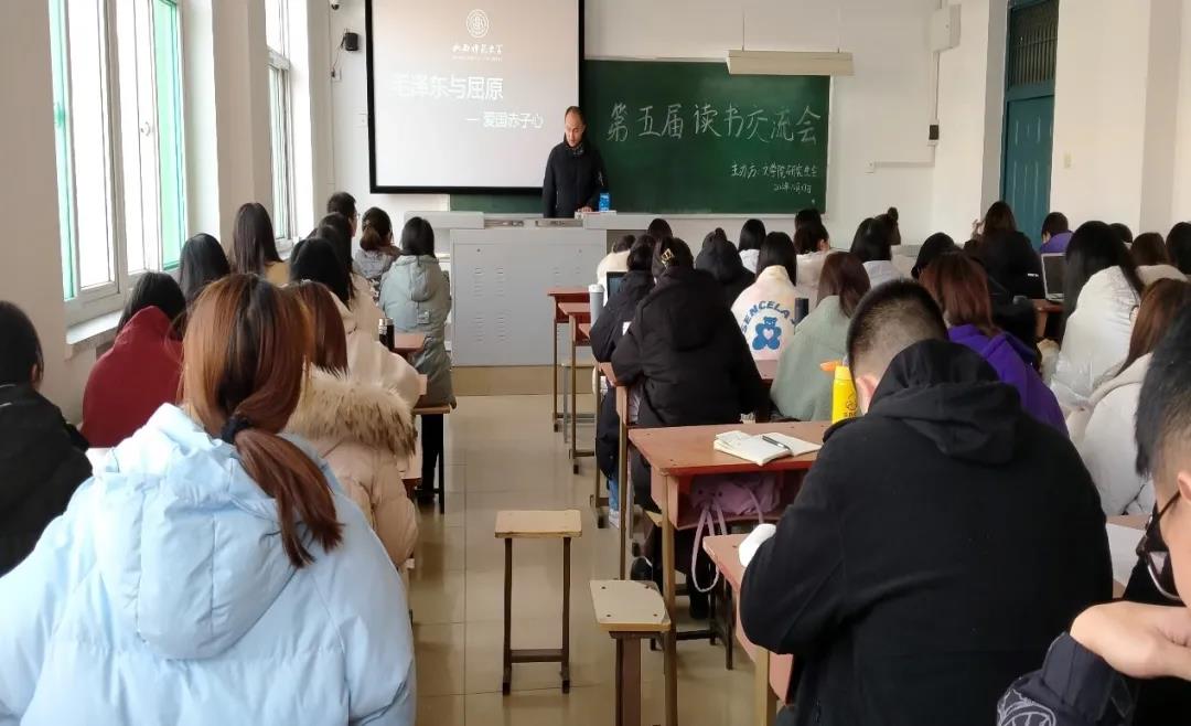 国之将亡,屈原拼尽生命的全部能量最后一跃,以身报国,将自己定格成中国历史上最闪耀的悲剧英雄;而毛泽东在民族存亡之秋,领导中国共产党和中国人民几次力挽狂澜,出奇制胜地挽救了革命,将一个黑暗的旧中国变成了光明的新中国。通过几位主讲人的精彩展示和同学们积极踊跃的交流探讨,大家在诵读经典中感受到了前人真挚的爱国情怀,也在读书交流会上激发了读书热情、迸发了思想火花。