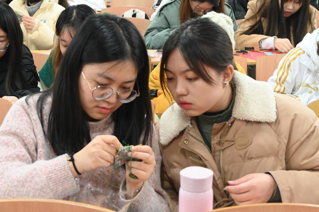 香囊又名香袋、花囊,是把多种香味浓烈中草药细末装入袋,用五色丝线缠成的。中药香囊文化源远流长,商周时期已有记载,明清发展到鼎盛时期。佩戴香囊以防病,是中医治未病的一种特色疗法。不论南方北方,每到春夏之交的端午节前后,盛行佩戴香袋,以驱毒虫、散浊气。“真好看!”“我想要红色的!”“可以教教我怎么缝嘛!”在发放香囊材料包时,同志们激动地说道。按照材料包的说明和民俗学社成员的指导,同志们互相帮助,精心缝制着香囊。