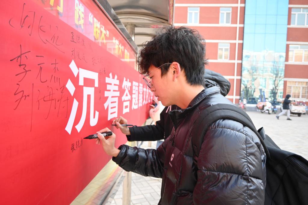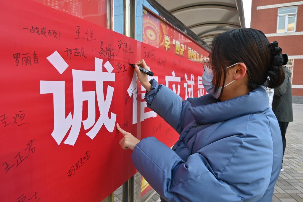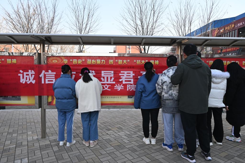 志愿者在文化宣传栏张贴了诚信考试横幅标语:“沉着答题露文曲之华,诚信应试显君子之德”,并有序组织vsport官方网站的同学在横幅上签名,郑重承诺。活动负责人李楠讲道:“天气很冷,但同学们对考试的敬畏之心是滚烫的,对学习的热情是火热的。诚信考试,你我同行。希望大家都能取得理想的成绩。”