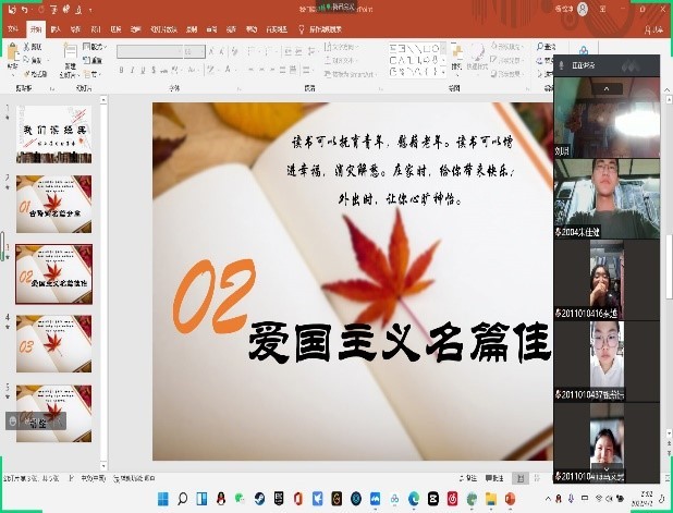 为调动员工们读书的积极性,激发员工读书的兴趣,多读书、读好书,营造良好的读书环境,以滋养人文情怀,公司各团支部积极开展线上读书分享会,朗读习近平总书记经典讲话、抗击疫情优秀报道、爱国主义名篇佳作、古诗词名篇等,引导员工在读书与思考当中厚植爱国主义情怀,提升修养,涵育理性平和的心境品格。