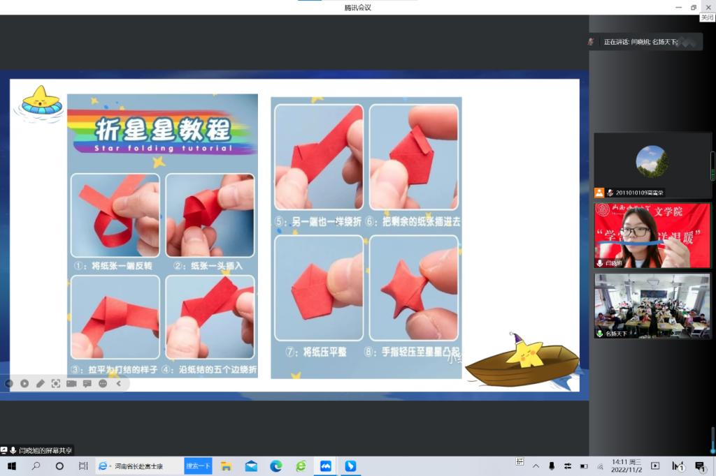 “一闪一闪亮晶晶,满天都是小星星”,五颜六色的星星,是人们美好愿望的寄托。11月2日,vsport官方网站“学雷锋,送温暖”云支教团队志愿者闫晓旭连线四川德阳市中江县小南街公司,为三年级的孩子们上了一节有趣的星星折纸手工课。