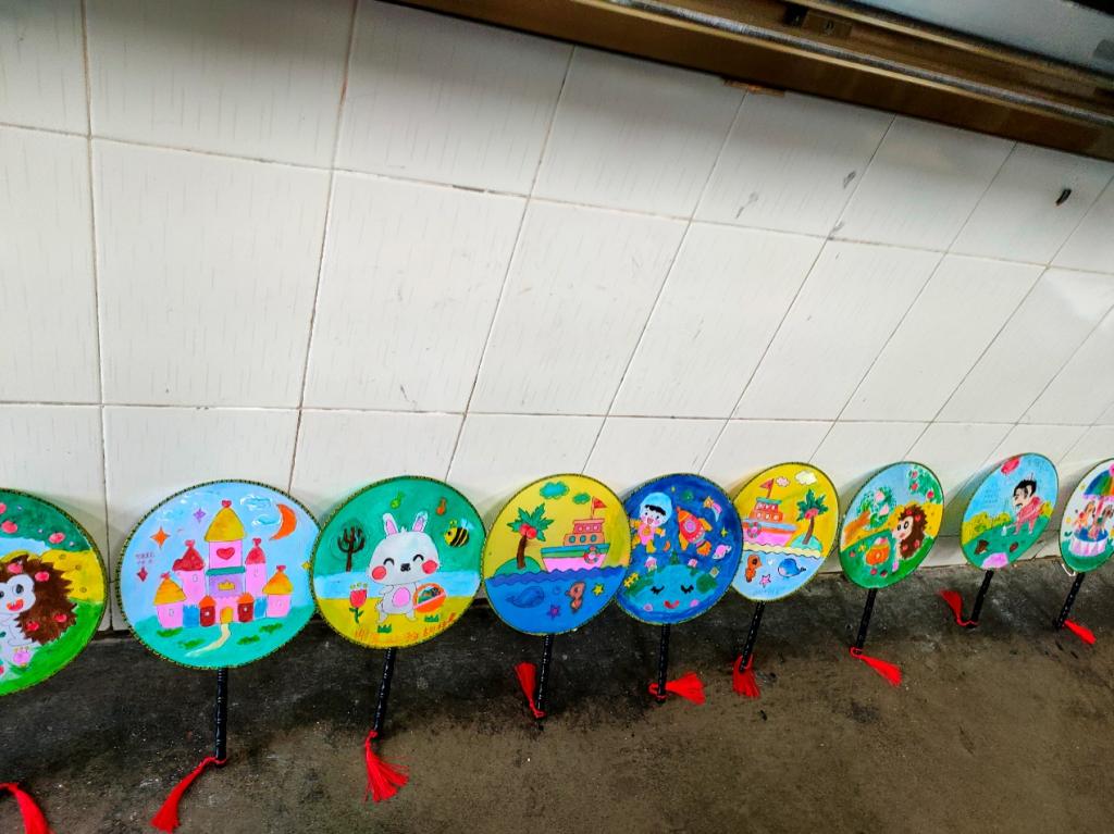 “打开半个月亮,收拢袖里可藏,天凉它无用,天热它才忙”,郭老师以谜语开场,为大家简要介绍了扇子的用途、构造、种类以及扇子的历史渊源。在谈到制扇技艺时,郭老师为同学们播放了扇面彩绘视频,让他们对传统制扇步骤有了初步的认识。彩绘环节时,郭老师对绘画扇子的上色技巧和注意事项进行了详细的讲解,并现场展示了如何画出各种简单又漂亮的花朵。在老师的指导下,同学们开始了创作之旅,沾颜料、填色、勾边,孩子们充分发挥了自身的想象力,创作独属于自己的扇画作品。课程最后,同学们迫不及待地展示各自的扇画作品并相互交流绘画方法与心得,整堂课弥漫着孩子们浓厚的创作热情和欢快的笑声。