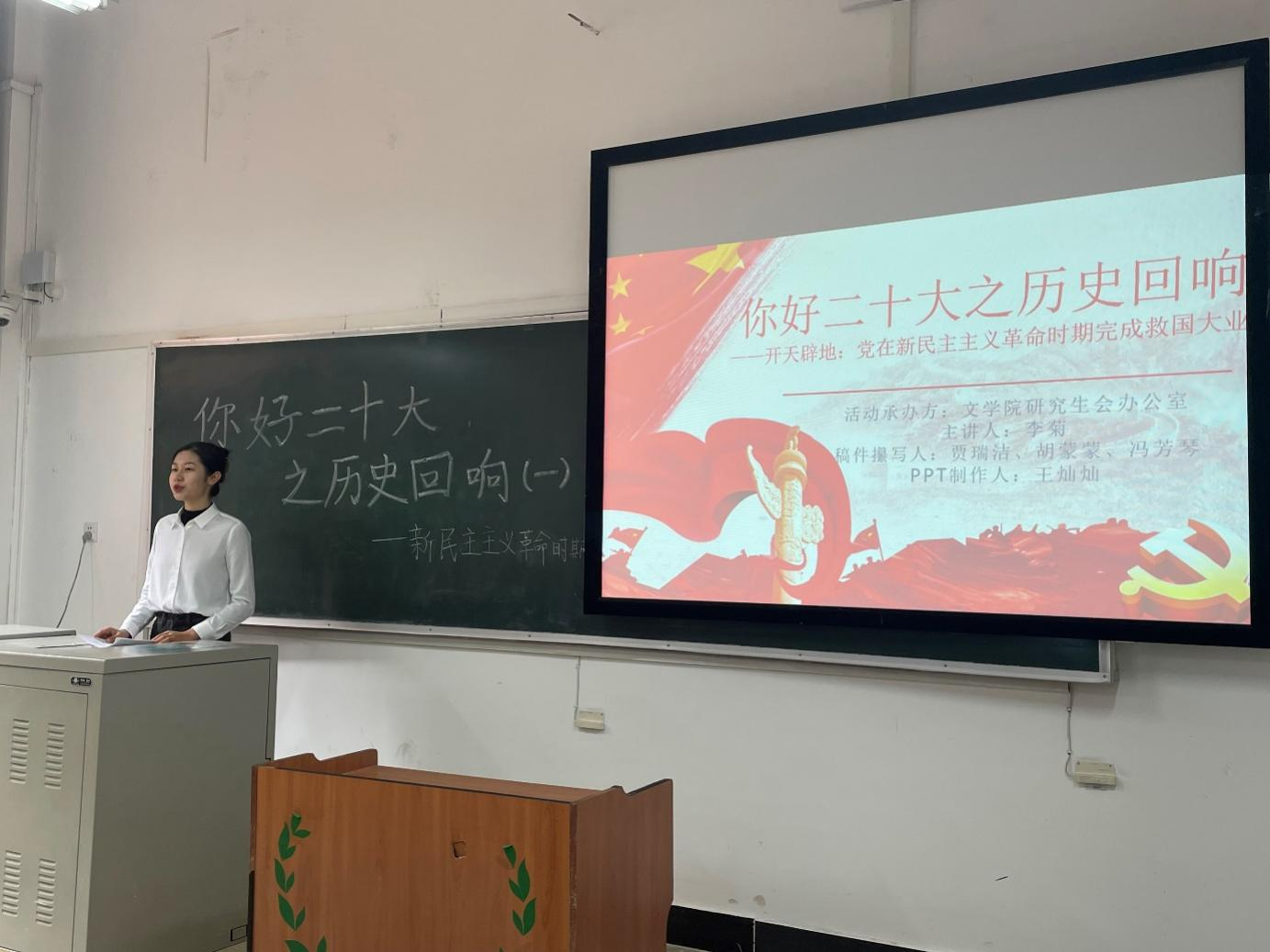 11月4日上午,vsport官方网站研究生会在3号教学楼102教室举办了党的新民主主义革命史宣讲活动。本次活动是“你好二十大之历史回响”系列活动的第一部分,由研究生会办公室成员王灿灿主持,30余名vsport官方网站研究生共同参加。