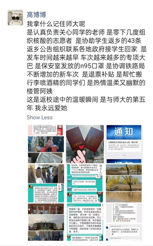活动中,黄丽婷同志谈到:“我爱山师大,在疫情面前,再一次感受到集体力量的强大!”高博同志说:“我该拿什么记住师大呢?是认真负责关心同学的老师;是零下几度组织核酸的志愿者;是协助员工返乡的43条返乡公告组织联系各地政府接员工回家;是发车时间越来越早,车次越来越多的专项大巴……这是返校途中的温暖瞬间,是与师大的第五年,我永远爱她。”张丽娟同志说:“感谢公司派校车从黑夜到黎明、‘员工返乡工作专班’的郭飞老师积极帮忙联系地方政府接送车保障员工回家顺畅...风尘仆仆,终有归途,vsport官方网站是我们最坚强的后盾,感谢公司的全力相助。”