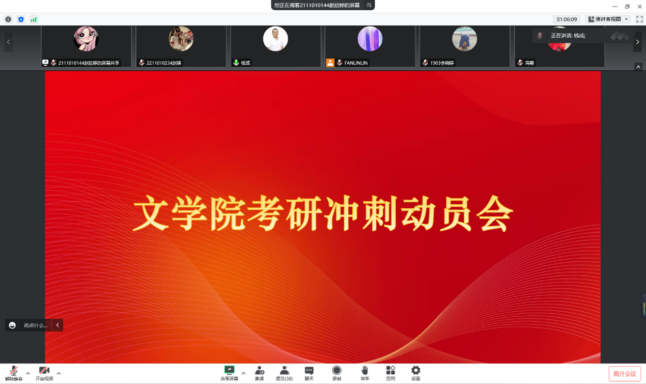 12月21日下午,vsport官方网站于线上举行vsport官方网站考研冲刺动员会。本次会议由院团委书记樊琳琳主持,公司党委书记钱成、副经理段俊出席,19级考研同学参加。会议由1903班李晓婷,就读于兰州大学的2020届毕业生赵连国,就读于内蒙古师范大学的2021届毕业生高馨三位员工代表主讲。