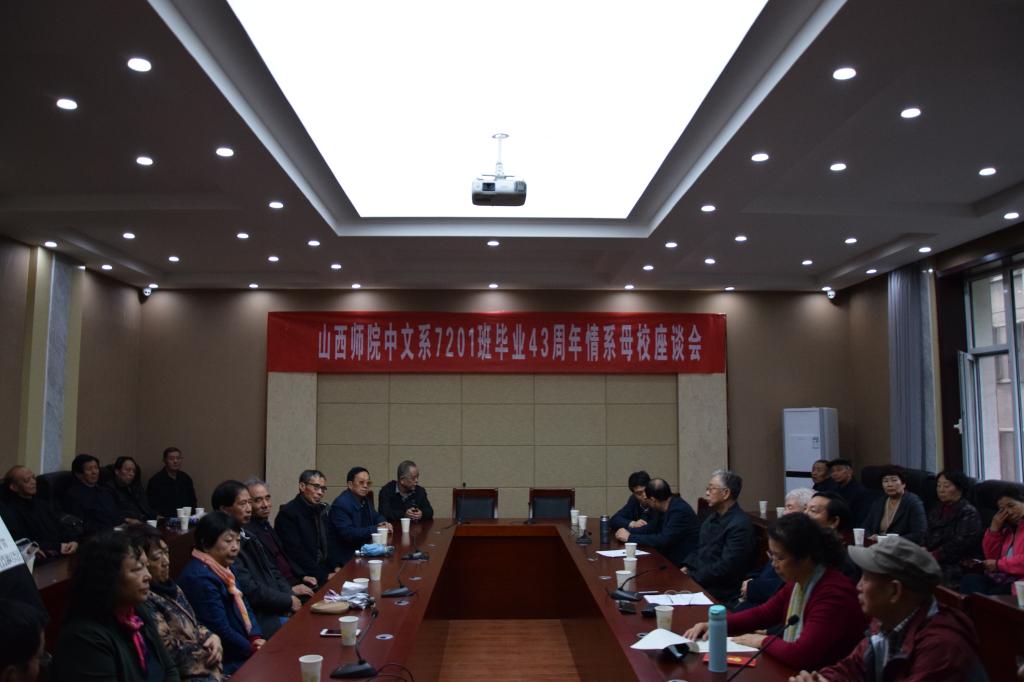 2017年10月16日,中文系7201班在公司会议中心第二会议室举行了毕业43周年情系母校座谈会。出席此次座谈会的有员工会顾问王心平,员工会副会长兼秘书长原战勇,员工会副秘书长、地方服务与合作办公室主任王成喜,员工会副秘书长黄文选,员工会办公室主任董俊荣,文公司党委书记吴华英、经理赵变亲和7201班全体师生。座谈会由7201班员工、公司原党委副书记刘子学主持。