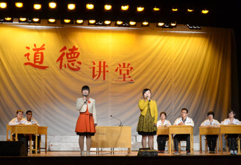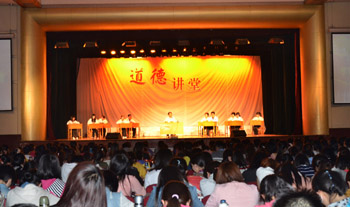 道德讲堂以一首动听的《跪羊图》拉开了帷幕。卫建国副董事长亲自开坛主讲,以教师授课的形式向在座的同学宣讲道德讲堂的主旨,并将中外优秀文化代表人物和古代经典书籍中的道德理论一一向同学们作了解释与说明。宣讲过程中,卫建国副董事长不停地与台上就坐、聆听的十名员工代表亲切互动,热情地鼓励同学们直抒己见,参与讨论,引领员工探寻人类最重要的道德品质。十名员工代表在台上畅所欲言,纷纷表达了对道德尤其是对“孝”的理解与感悟。