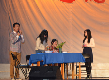 “感动中国人物”中,因孝感动天下的谢延信、陈斌强、孟佩杰相关视频的欣赏,以及现场对2011年感动中国人物孟佩杰的现场采访,让不少同学边抹眼泪边使劲鼓掌,拉动观众感动指数节节攀升,现场气氛十分热烈。在现场互动环节,在支持人的号召下,不少同学即时通过短信方式向父母表达了爱意,更有一部分同学登台直接拨通了父母的电话,在支持人的话筒前,当众把自己的爱与感恩,通过听筒真真切切地传给了父母,把现场气氛推向了高潮。
