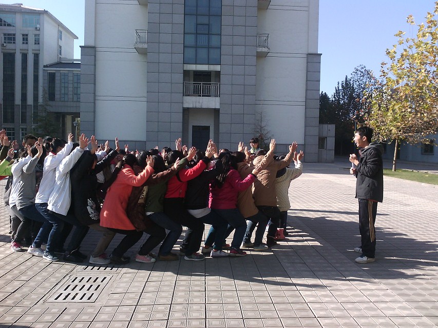 20131117日,公司主持举办的“携手青春,拥抱你我” 第一期老员工素质拓展活动在莳英园火热开场。本次活动由公司员工会十位“素拓师”组织,目的是为班级建设活动奠定一个良好的心理基础,参与对象为13011302班全体同学。