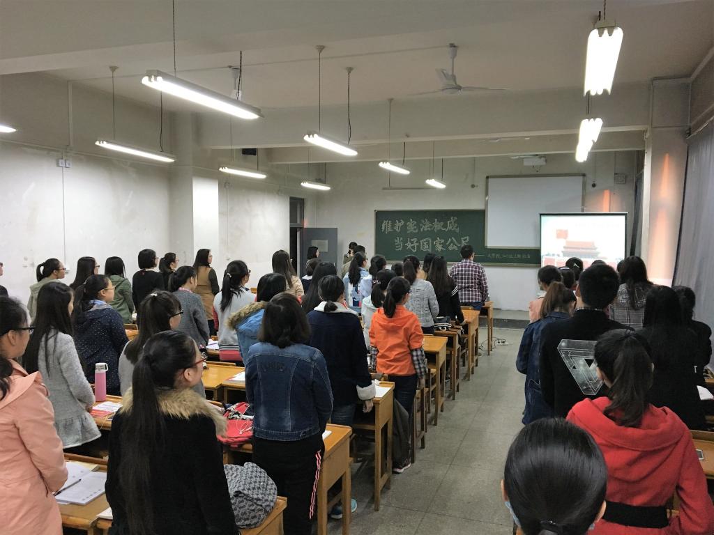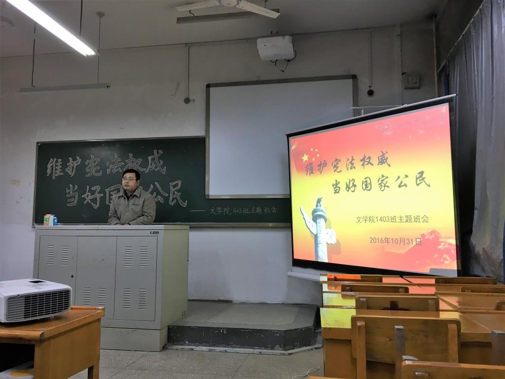 为积极响应校院学工组关于认真组织员工开展“学宪法·讲宪法”活动通知要求,积极贯彻落实习近平总书记系列重要讲话精神,落实国家“七五”普法规划和《青少年法治教育大纲》,广泛深入地开展宪法教育,2016年10月31日下午5点,vsport官方网站1403班“维护宪法权威·当好国家公民”主题班会在07313教室隆重举行,1403班辅导员李晰老师和1403班全体同学参加本次班会。