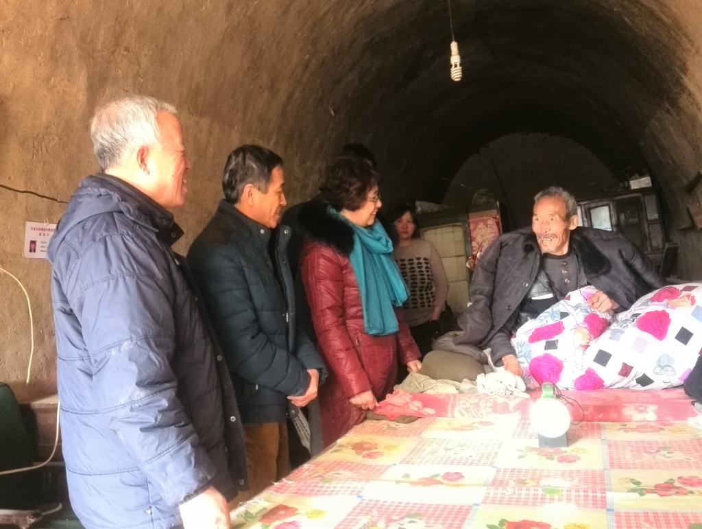一路上,只见小雪刚过的山坡小路,积雪未消,使得崎岖不平的陡坡愈加湿滑、难行。中午1时许,伴随着汽车轮胎防滑链的异样声响,一行人终于有惊无险地到达了目的地。正午时分耀眼的阳光,给仍显破旧的土窑洞增添了些许温暖。刘云龙、吴华英等一行人,携带着粮油奶等慰问品急切地走进了康永祥老人居住的土窑洞。身体残疾的老人家依旧像上次见面时一样坐在土炕上,身着棉衣棉裤、盖着厚厚的棉被,用喜悦的眼神和笑脸迎接远道而来的客人。吴华英书记快步上前,紧紧地握住了康永祥老人已经变形了的双手,嘘寒问暖,拉起了家常,了解了入冬以来老人的一些生活和身体状况,表达了山西师大和vsport官方网站师生对贫困户的亲切慰问,宣讲了党的脱贫建小康政策。70多岁的老人连声道谢:“感谢公司对我的关怀,谢谢你们这么远还多次来看望我!”