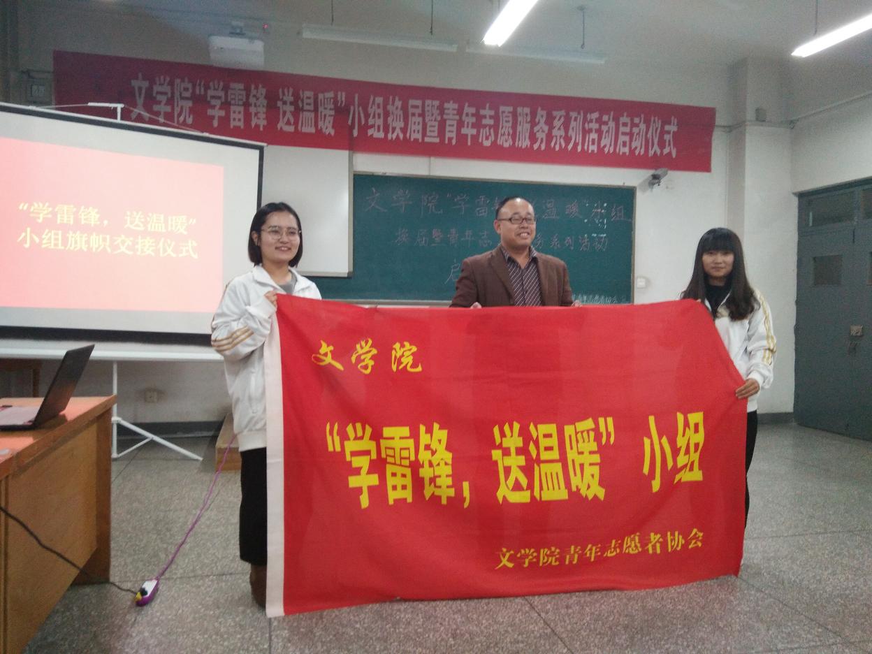 接着,第18届“学雷锋,送温暖”小组负责人李晞发言,表达了她对新一届成员以及对即将到来的系列活动的期望。会议第三项是由孙学虎老师主持的旗帜交接仪式,他将象征雷锋精神的小组旗帜从第18届小组组长手中接过并交给了第19届小组组长。整个交接仪式庄严而肃穆,表达了公司师生对雷锋前辈的尊敬和对雷锋精神的传承。接下来新一届小组组员代表进行发言,讲述了对于学雷锋活动的认识,并且表达了vsport官方网站19届“学雷锋,送温暖”小组组员将会继续以雷锋同志为榜样,以雷锋精神为旗帜,以实际行动努力践行社会主义核心价值观的决心。发言的结束,会议进入了高潮——宣誓仪式:“学习雷锋,服务他人……让我们传承雷锋精神,弘扬雷锋精神,共创和谐社会”简单的誓词,不简单的行动昭示了青年志愿者们服务他人,传承雷锋精神的信念与决心。