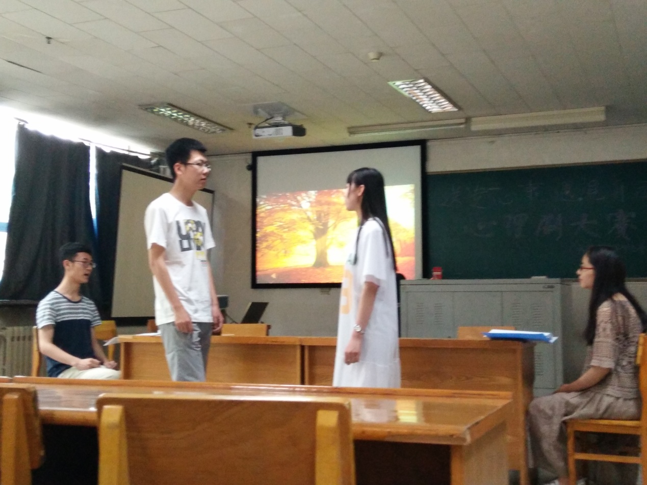 来自大一大二两个年级的13个班级参与了本次比赛,主持人精彩的开场白后,1501班带来了催泪煽情的心理剧—《仰望》,将全场带入了温情的氛围。随后1601班毫不逊色的演绎了《守望天空》,赢得了全场掌声。1606班紧随其后,以精湛的演技诠释了《救赎》,接下来16041605班级依次为大家带来了精彩的心理剧表演。由1502,1503,1603三个班级合作的心理剧《心门》更是赢得了全场喝彩。接着1602,1607,1504,1505,1506各班都以幽默且富有感情的表达将比赛推向了高潮。各班表演结束后,办公室部长进行了总结发言,最后1506班以深刻又富有情感的《但为君故》获得了一等奖,16011602班获得了二等奖,160715041505班获得了三等奖。