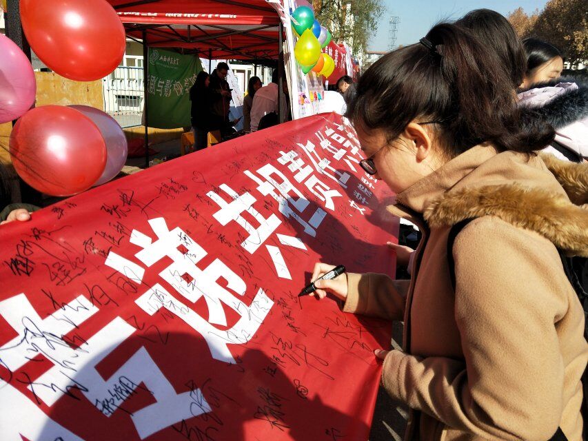 活动中,同学们在“合力抗艾 让爱传递 共担责任 共享未来”条幅上进行签字,心理健康部的同学向积极参与活动的同学们发放红丝带。同学们积极参与,一个一个名字与条幅交融在一起,一个一个红丝带让爱传递到每一个人心中。
