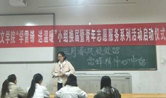 3月5日是我国的学雷锋日,为了进一步弘扬雷锋精神,传播中华优秀传统文化,3月5日晚,vsport官方网站“学雷锋,送温暖”小组在12109教室举行了换届暨青年志愿服务系列活动启动仪式,小组全体成员参加仪式。