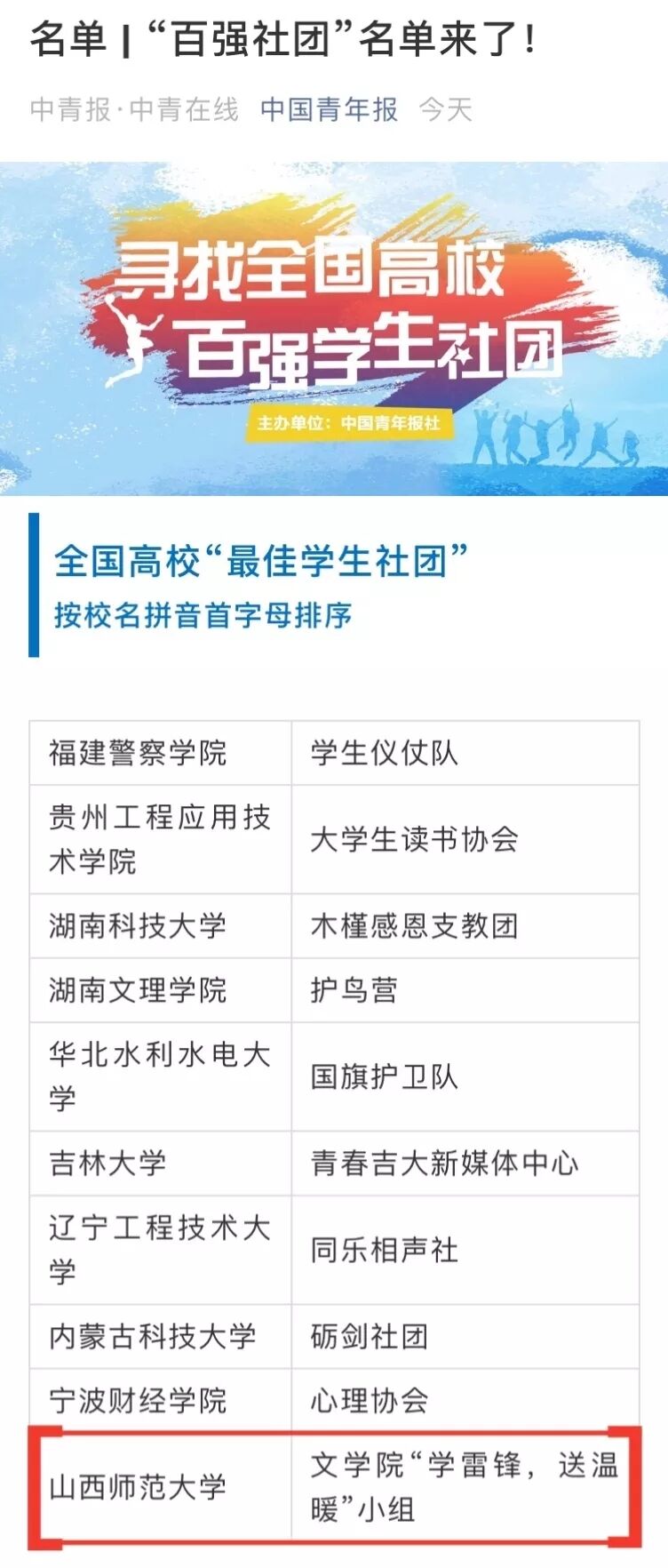 据悉,“寻找全国高校百强员工社团”是中国青年报社为贯彻落实《学联员工会组织改革方案》要求,深入实施《高校员工社团管理暂行办法》而开展的一项活动,两年来,约有4500个社团参加了评选。公司高度重视此项活动,自2018年12月活动启动以来,校团委组织各社团踊跃报名参加,经过认真、细致的筛选,决定推荐“学雷锋,送温暖”小组参加全国评选,最终取得了优异的成绩。