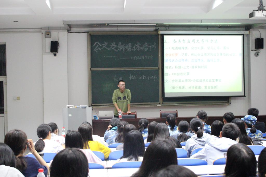 9月22日晚,vsport官方网站在07126教室举办公文及新媒体相关培训会。培训会由公司党委宣传部张蕴强老师,原院团委宣传部部长、大四员工郭豪杰主讲,吸引了150余名员工到场聆听。