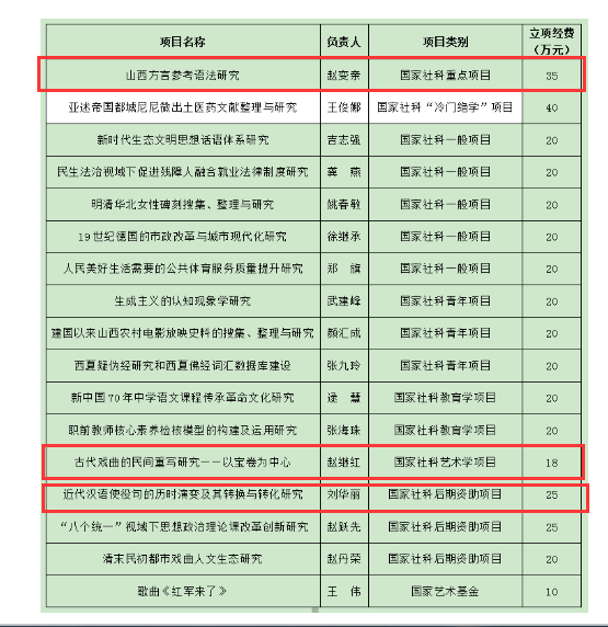 2019年末,全国哲学社会科学工作办公室2019年度国家社科基金各类立项名单全部公布,公司共获批国家社科基金项目3项,赵变亲教授《山西方言参考语法研究》获国家社科重点项目立项;赵继红副教授《古代戏曲的民间重写研究——以宝卷为中心》获国家社科艺术学项目立项;刘华丽博士《近代汉语使役句的历时演变及其转换与转化研究》获国家社科后期资助项目立项。