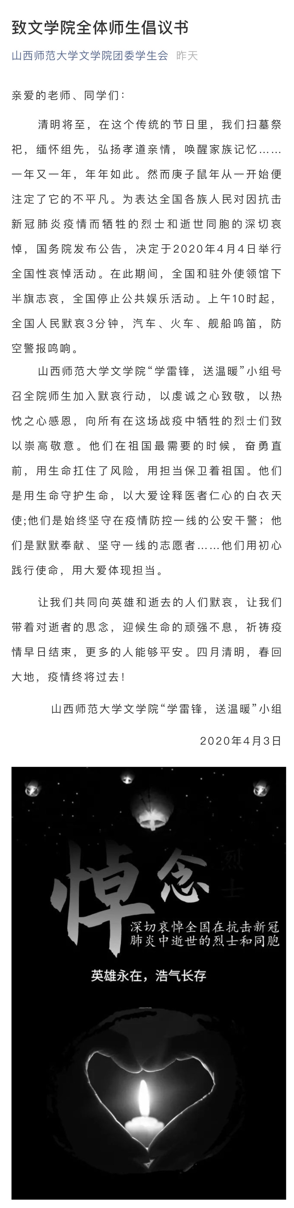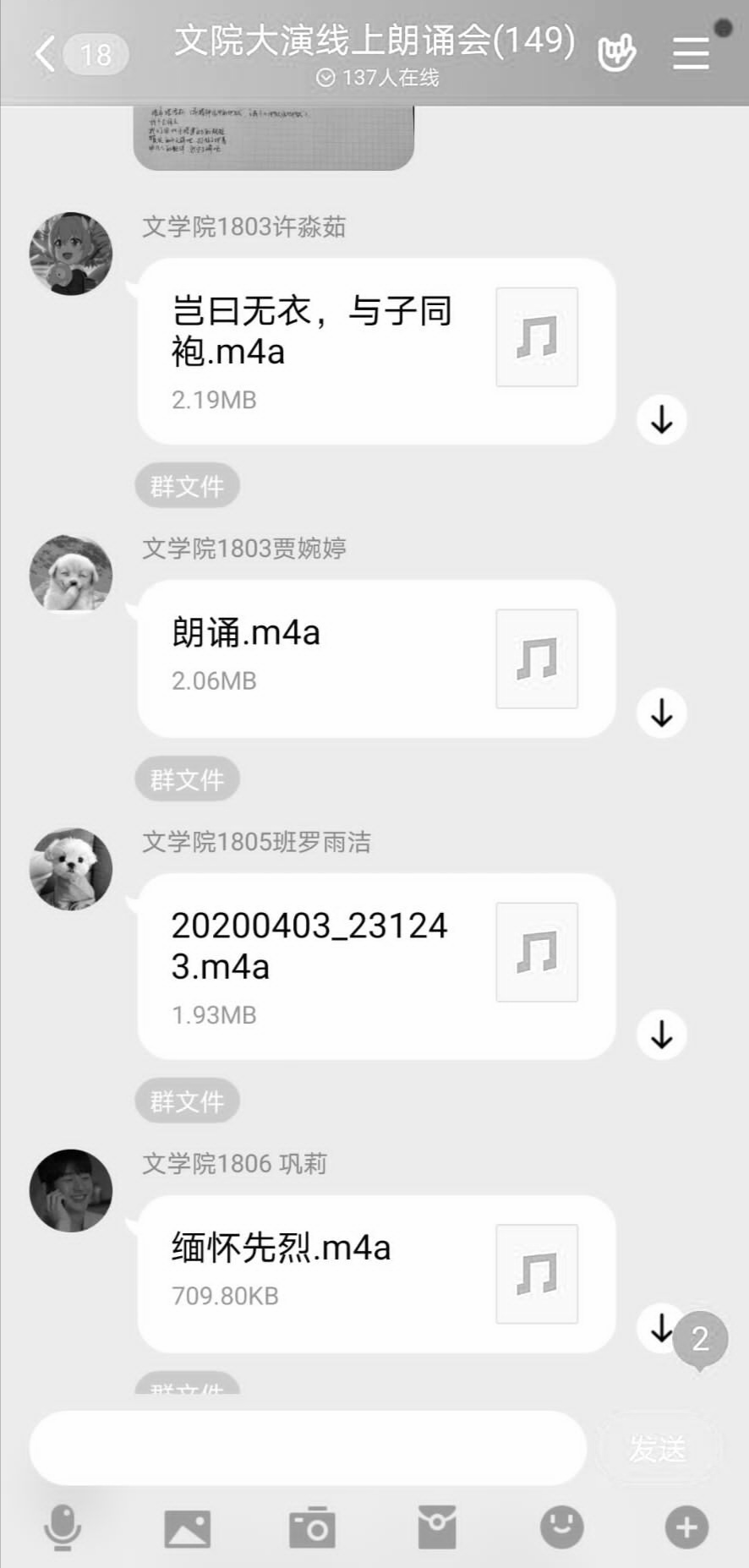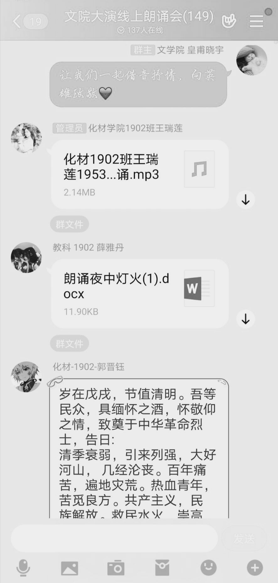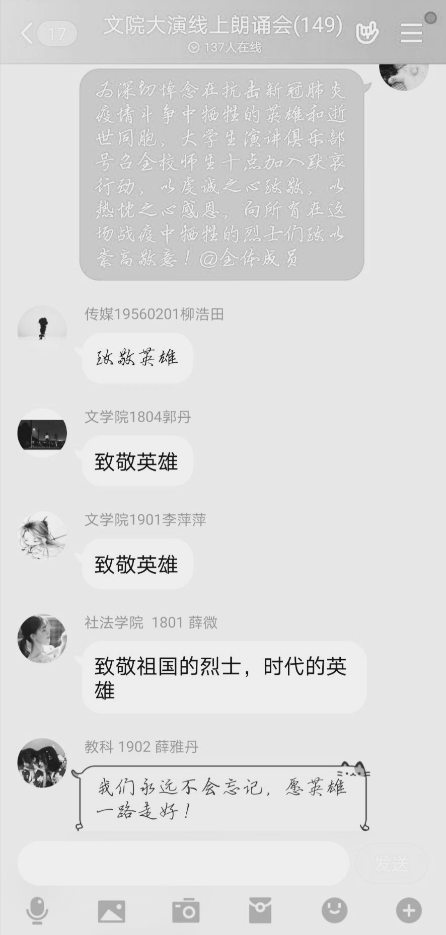 在文公司党委和小组的倡议下,上午10时整,全体同学在家立正默哀,为因抗击新型冠状病毒肺炎而牺牲的烈士及逝世同胞哀悼,向英雄们致以崇高敬意与美好祝愿。随后,小组与老员工演讲俱乐部联合开展的线上朗诵会正式开始,同学们纷纷在活动群上传自己的朗诵音频,借音抒情,在这特殊的节日为战疫英雄们送去最朴素的赞礼。