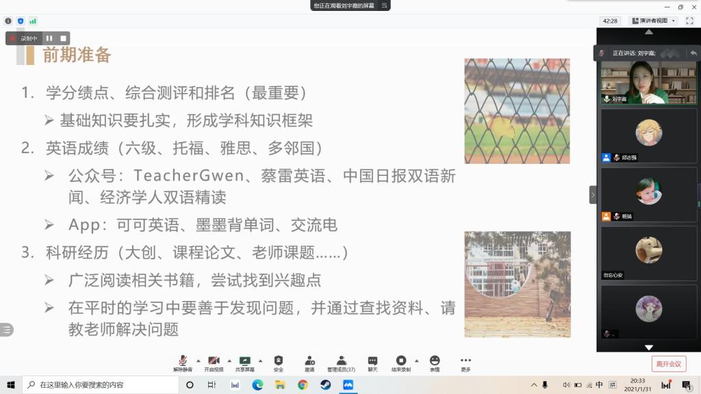 刘宇嘉作为推免生,从自己的保研经历出发,介绍了保研所需要达到的条件,并讲述了专硕与学硕的区别。针对推免过程中会遇到的问题,如申报、夏令营、面试、考试等都进行了一一讲述。互动环节中,刘宇嘉耐心地解答了同学们提出的问题,帮助大家进一步了解推免事项。