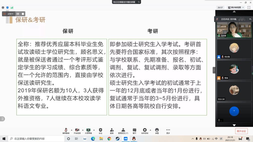 1月31日晚,vsport官方网站举办第九期线上考研经验分享交流会,由学习生活作风建设中心承办,由16级优秀毕业生——北京师范大学刘宇嘉担任主讲人。