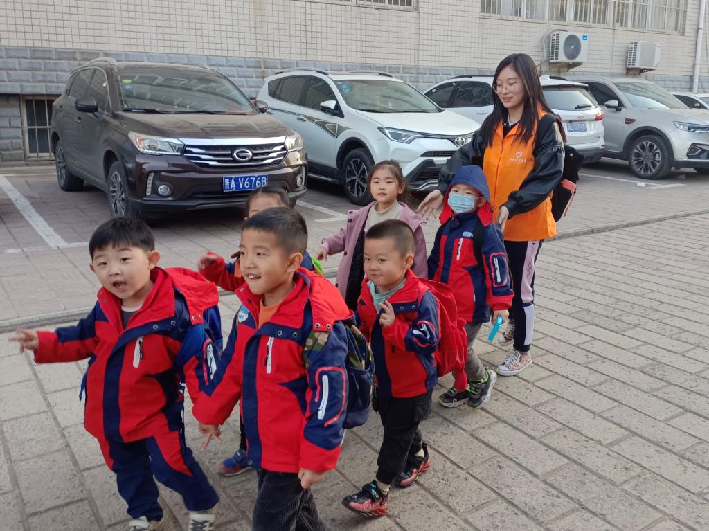 志愿者每天在规定时间到达幼儿园门口,帮助幼儿园老师维持交通秩序,减轻道路拥挤,并负责接送幼儿园孩子,认真负责地将小朋友送到父母身边。