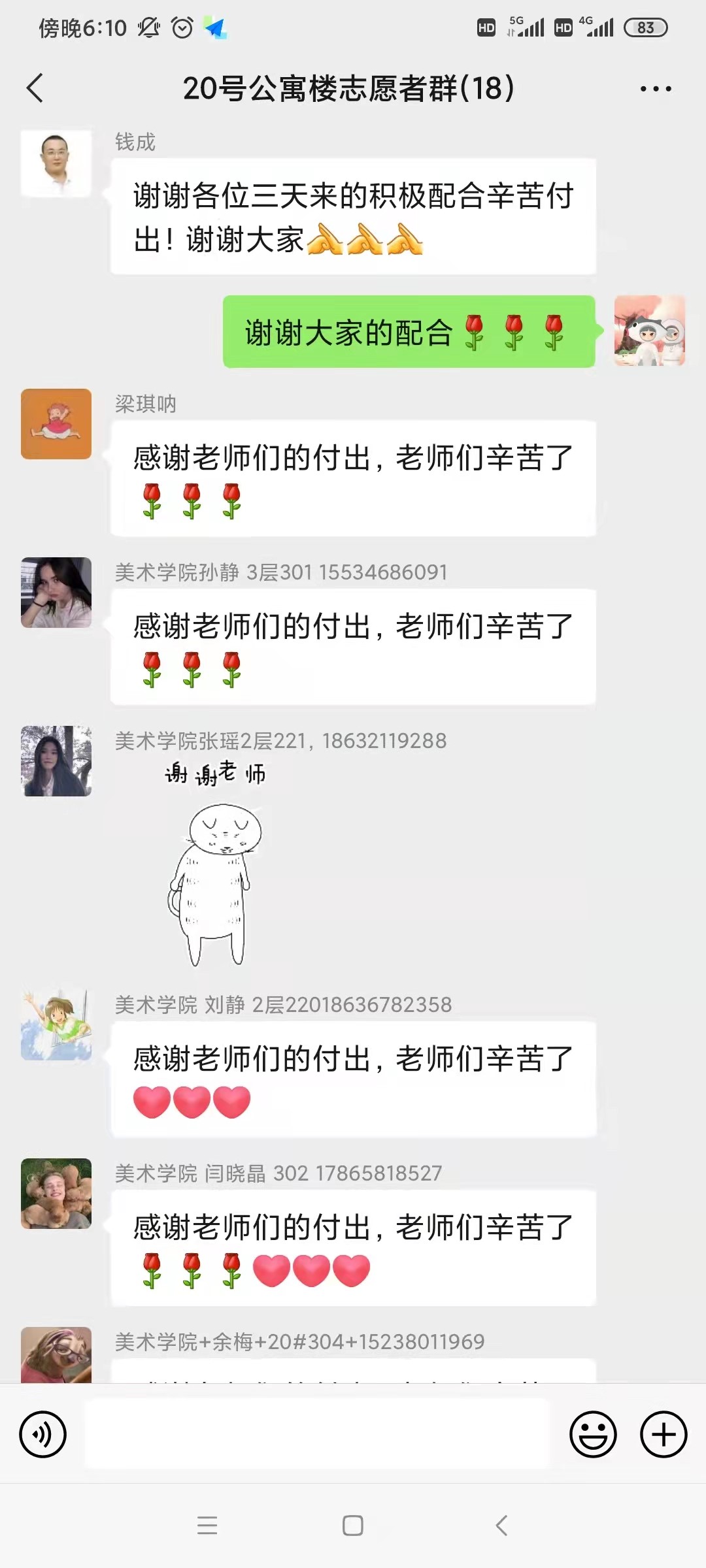 疫情防控演练期间,我们同员工们亦师亦友。员工们一有困难,老师们就尽全力去解决;员工们看见老师们辛苦工作,也亲切地问候一声:老师,辛苦你们了,谢谢老师!我们也被深深地感动。每当晚上有的员工饿了,我们就及时将情况反馈给后勤处,后勤处老师很快地给员工们送来干脆面、面包、牛奶。这疫情防控演练,我们每个人都做能做之事,爱所爱之人;有一分光,发一分热。当脸部受伤的员工需要换药了,我们及时联系校医院来给员工们置换药品;当毕业班的员工需要线上笔试、面试了,我们也同员工们共同为其营造良好、安静的环境;当员工们因为情绪问题而产生压力与焦虑了,我们同他们静心而坐、谈心谈话,疏导内心的烦闷,用实际行动筑牢员工的“心理防疫墙”。而当我们自己生活中防疫物品不足的时候,员工们则关切地给我们送来脸盆、暖壶、洗漱等用品。此刻,这20号员工公寓成为师大“防疫之舟”上安乐的小窝。