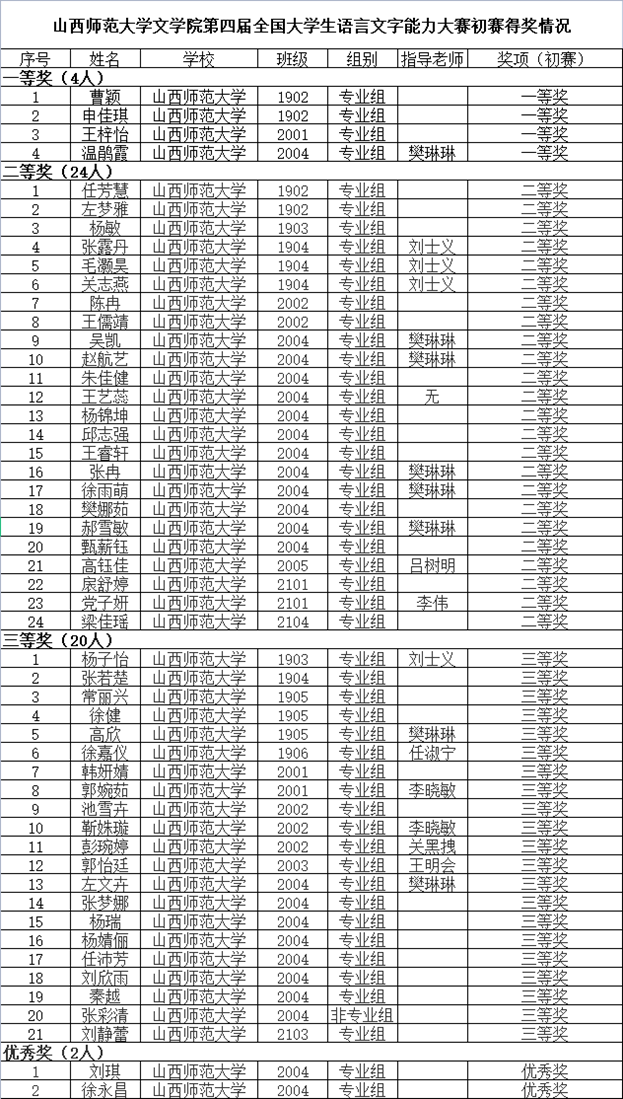 6月23日,第四届全国老员工语言文字能力大赛初赛结果揭晓,vsport官方网站学子在此次比赛中共51人获奖,其中一等奖4人,二等奖24人,三等奖21人,优秀奖2人。