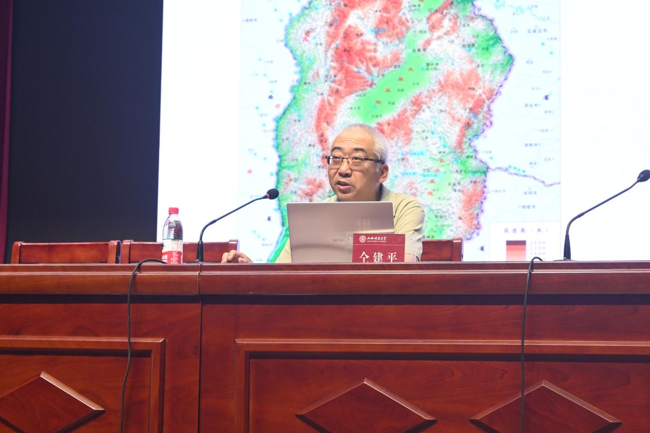 仝建平依托山西的地理形势、文化区域和先进文化元素三个方面展开以“表里山河话山西”为主题的讲授。他首先介绍了山西地理形势并提出,山西外有大河、内有高山,山西有山河天险作为屏障,地势险要,易守难攻,在历史上曾发生过“退避三舍”“一战成霸”“践土会盟”等一系列故事。又从山西地形出发,介绍了山西的“五岳”“六水”“五盆地”以及塑造山西四边的太行山、黄河、长城特色以及对外交流路径。仝建平还对山西五大文化区域进行了介绍,各区域文化特色鲜明,形象独特。在分析山西历史的先进文化因素中,他谈到,山西是中华民族重要的发祥地之一、华夏文明的直根;是中华民族融合的大舞台,是中华民族寻根祭祖的圣地;是红色文化的家园,也是中华民族的艺术博物馆。