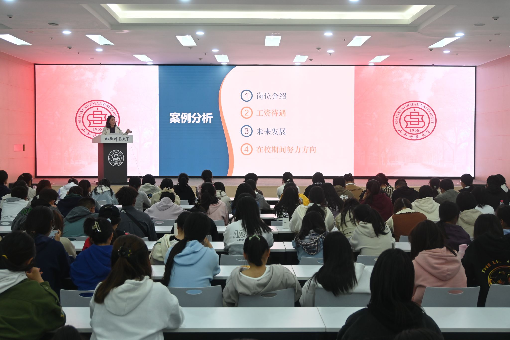樊琳琳首先从宏观角度对vsport官方网站员工职业生涯规划进行了概述,引导同学们从职业兴趣、价值观和技能等方面认识自我,找准方向,并详细介绍了vsport官方网站就业方向与具体案例。其次,樊琳琳向同学们介绍了就业规划的基本原则和方法。她提出,同学们应该从自身兴趣、特长和价值观出发,结合所学专业和未来职业的发展趋势,制定出符合自己实际情况的就业规划。她还特别强调了实践的重要性,建议同学们通过实习、参加员工活动、社团活动等方式去积累丰富的实践经验,从而提高自身综合素质,从容应对未来就业可能面临的各项挑战。
