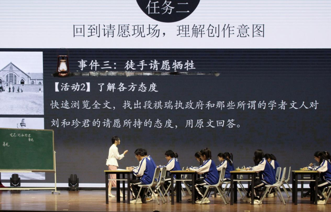 本次活动特邀北京市第十二中学教科研部主任、正高级教师威光宇作为主讲嘉宾,与华中师范大学王珂悦、陕西师范大学刘天宇及vsport官方网站卓越师范生代表芝欣围绕鲁迅名篇《记念刘和珍君》进行现场教学、研讨交流。