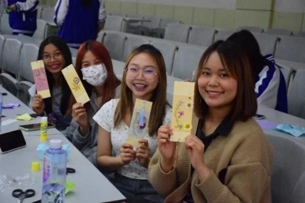 南区六号楼前活动形式多样,包括乡满民俗、故事里的民俗、民艺问民情等等。同学们在各类游戏中体验民俗知识,唤醒内心对于民俗文化的热爱;图书馆报告厅手工活动包括拓叶书签、押花书签、剪纸书签等形式。在工作人员的指导下,同学们自由创作,将新鲜的花草拓印在书签上,或将春日元素融入剪纸书签,制作出造型精美、独一无二的书签作品。同学们在动手制作的过程中感受优秀民俗传统文化的滋养与熏陶,造型精美的书签也为阅读增添了愉悦、轻松的氛围。
