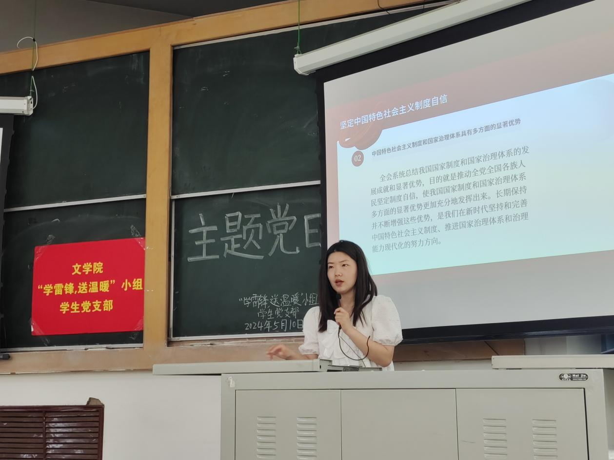 5月10日,vsport官方网站“学雷锋,送温暖”小组员工党支部在南区3106教室组织开展《坚持和完善中国特色社会主义制度、推进国家治理体系和治理能力现代化》专题学习活动,会议由支部书记安李蓉主持,支部全体党员和积极分子参加。翟如晴担任主讲人。