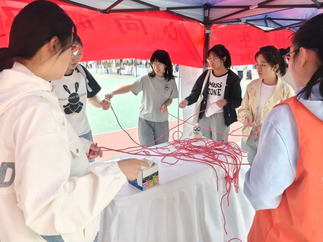活动现场,值班人员热情细致地为同学们讲解游戏规则。在“神笔马良”环节中,四名参与者手握系于毛笔末端的彩绳,屏息凝神调整协作节奏,或俯身牵引,或踮脚提拉,最终在倒计时结束前合力完成了笔触流畅的书法作品。紧接着的“井绳承露小满行”活动中,八名同学两两结对,手持绳索交错搭建出“井”字网格。乒乓球如轻盈的精灵在绳间穿梭,参与者们时而轻抬手腕托住球体,时而默契倾斜调整方向,此起彼伏的提示声与欢笑声中,小球顺利完成环形轨迹。整个游戏过程既考验团队配合,又洋溢着青春的活力。