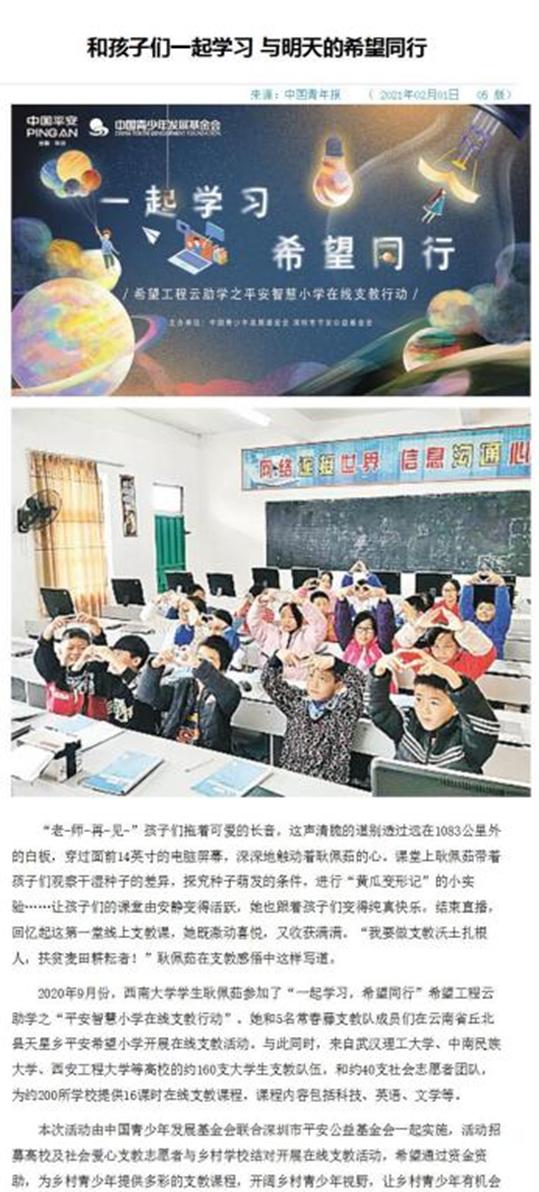 2021年2月1日,刊登文章《和孩子们一起学习,与明天的希望同行》。