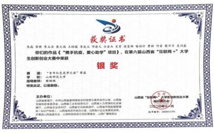2020年11月,《“携手抗疫,爱心助学”项目》在第六届山西省“互联网+”老员工创新创业大赛—“青年红色筑梦之旅”赛道中荣获银奖。